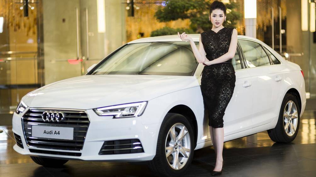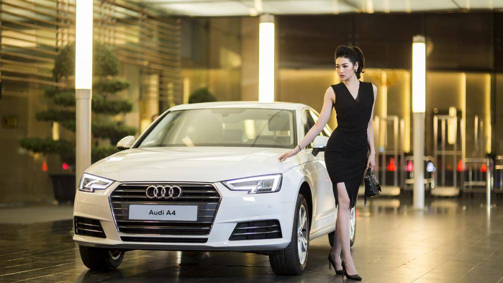 Audi A4 2016 có thiết kế cứng cáp và khoẻ khoắn kết hợp với nhan sắc dịu dàng của á hậu Tú Anh càng tăng thêm vẻ sang trọng, quý phái |