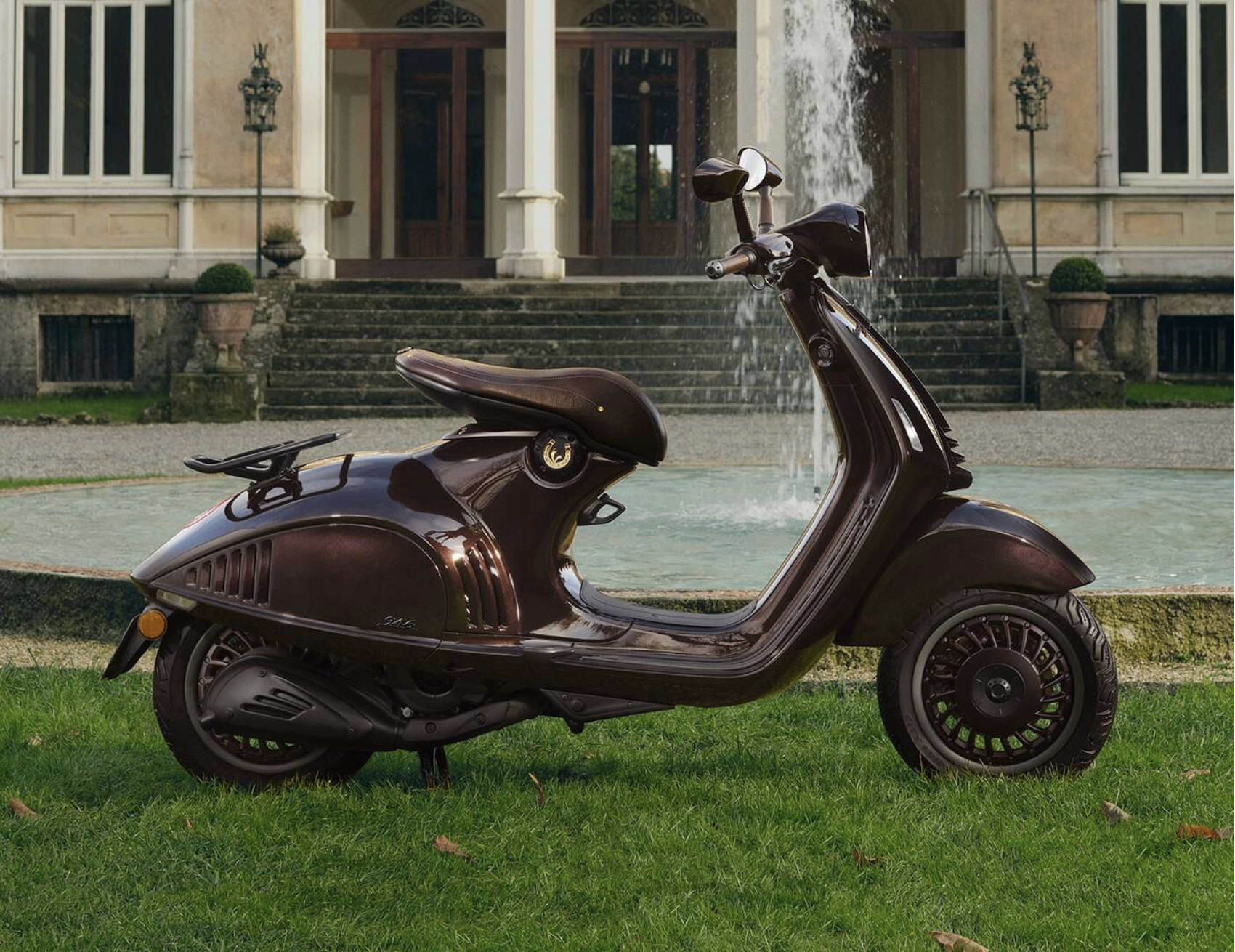 Vespa 946 Horse đi kèm với khung thân Vespa thiết kế riêng, yên đơn dạng lơ lửng đặc trưng, được tô điểm bằng biểu tượng chữ "V" màu vàng ánh kim cho logo Vespa.
