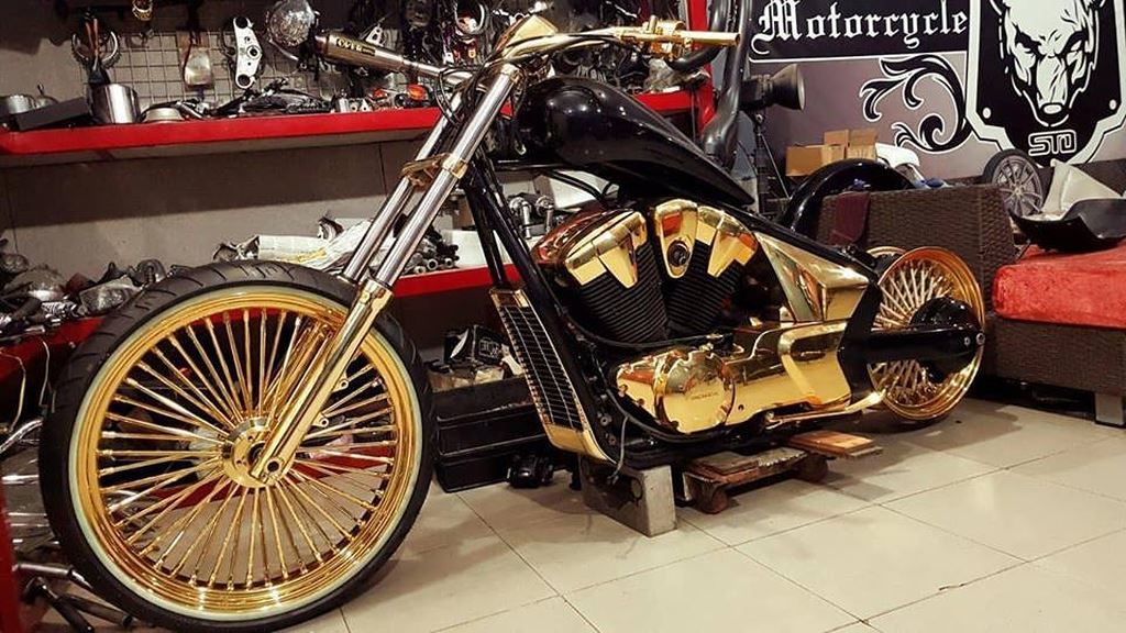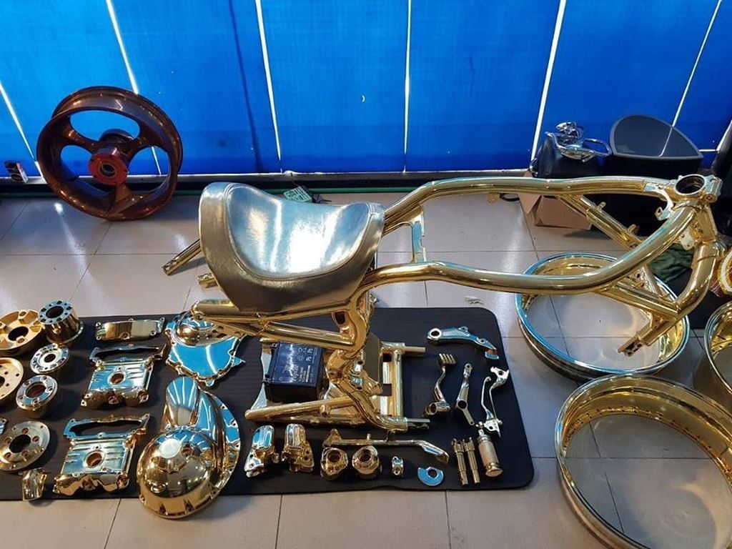 Anh cho biết, anh tiêu tốn 500 triệu đồng để mạ vàng mỗi chiếc mô tô, và tổng cộng hiện anh có 3 chiếc. 2 chiếc hiện đã được anh đưa về nhà, còn 1 chiếc vẫn trong giai đoạn hoàn thiện. |