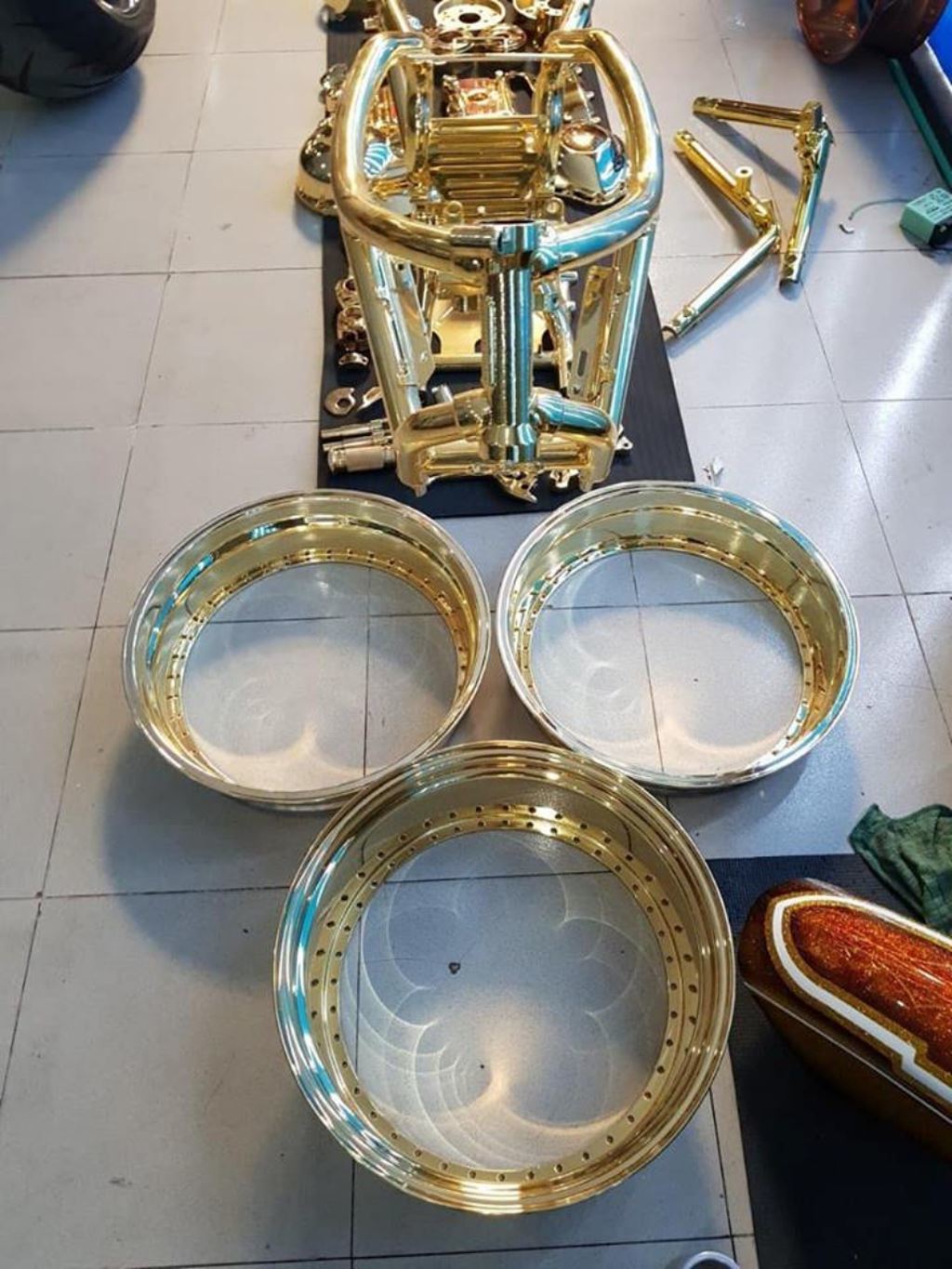 Như vậy, 3 chiếc mô tô mạ vàng của vị đại gia này đã có giá trị lên đến gần 10 tỷ đồng. Vàng được mạ lên rất nhiều bộ phận như vành, khung, vỏ ngoài động cơ, tay lái,... |