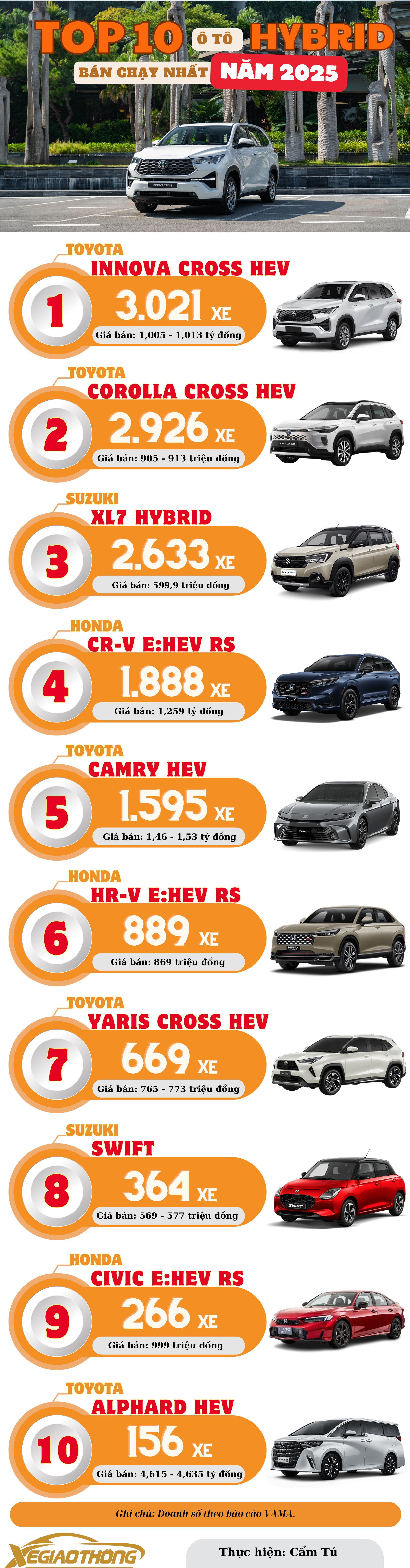 TOP 10 xe hybrid bán chạy nhất Việt Nam năm 2025